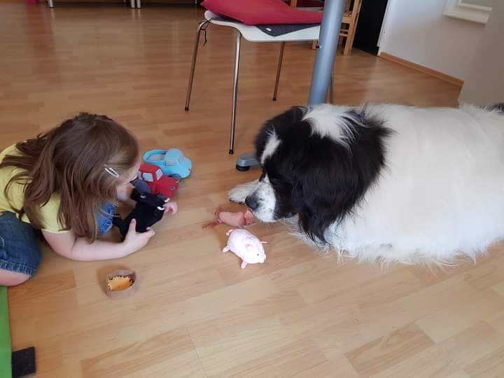 Balduin war ein Landseer Rüde, der mit seiner sanften und ruhigen Art, die Praxis von 2013 – 2020 bereichert hat. Trotz seiner enormen Größe ( 80cm Rückenhöhe 😉 ) hat er sich in alle Herzen gestohlen und Ängste und Blockaden bei Patienten jeden Alters gelöst.